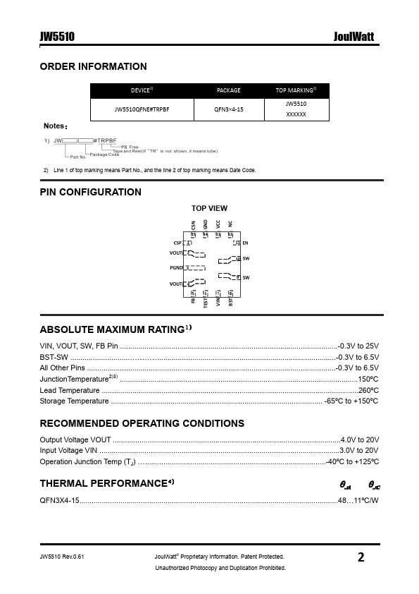 The JW5510 implements a synchronous high-efficiency step-up boost converter with 10A switch current capability and is capable of providing an output voltage up to 20V.