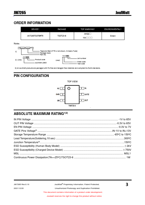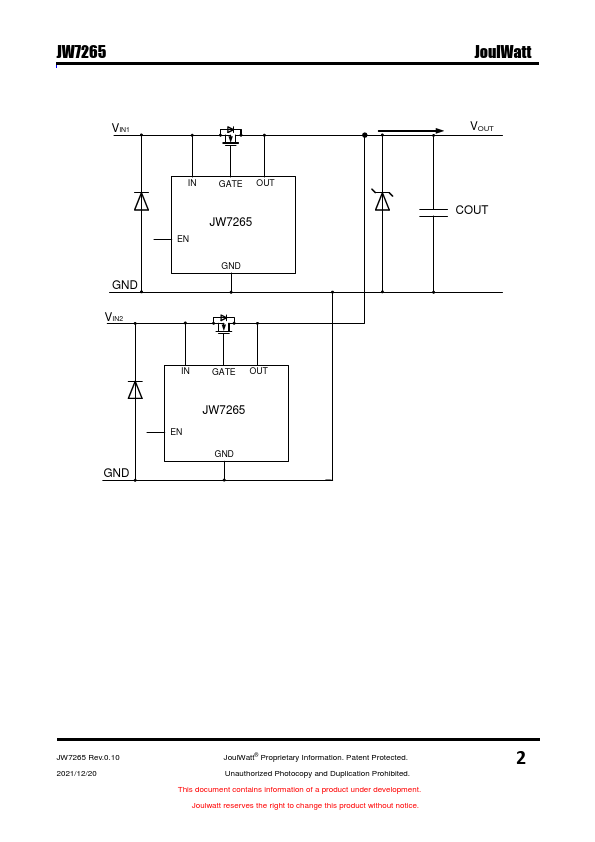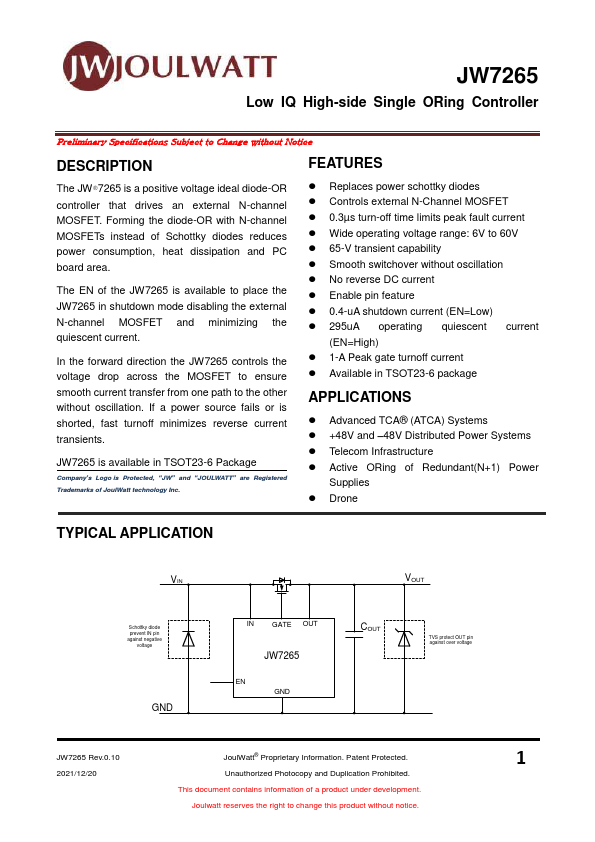 The JW®7265 is a positive voltage ideal diode-OR controller that drives an external N-channel MOSFET. Forming the diode-OR with N-channel MOSFETs instead of Schottky diodes reduces power consumption, heat dissipation and PC board area. The EN of the JW7265 is available to place the JW7265 in shutdown mode disabling the external N-channel MOSFET and minimizing the quiescent current.