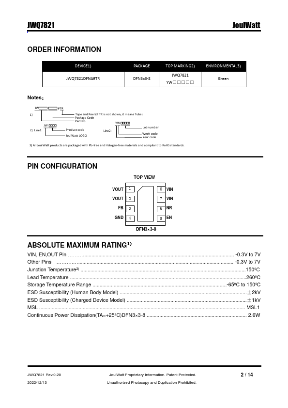 JWQ7821 is a 1A high accuracy, low noise, high PSRR linear regulator with 200mV maximum dropout voltage.