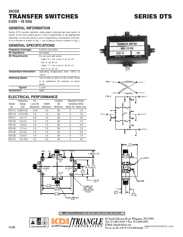 DIODE TRANSFER SWITCHES 0.025 - 18 GHz GENEwRwwA.DLatIaNShFeOet4RUM.coAmTION Series DTS transfer switches allow power entering two input ports, A and B, to exit from output ports C and D respectively, or by appropriate switching, to exit from ports D and C respectively. A functional schematic of a transfer is shown in Fig. 1, and a typical circuit is shown in Fig. 2. GENERAL SPECIFICATIONS Frequency Coverage: RF Impedance: DC Requirements: Temperature Information: Switching Speed: Typical: Connectors: 0.025 to 18.0 GHz. 50 OHMS. For all units with driver Logic “0” = Ins. Loss A→C, B→D Isol. A→D, B→C Logic “1” = Ins. Loss A→D, B→C Isol. A→C, B→D Operating temperature from –55°C to +85°C. 10% to 90% or 90% to 10% of RF. There is an additional 20 nanosec of driver delay.