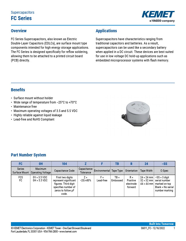 Supercapacitors FC Series Overview FC Series Supercapacitors, also known as Electric Double-Layer Capacitors (EDLCs), are surface mount type ponents intended for high energy storage applications. The FC Series is designed specifically for reflow soldering, allowing them to be attached to a printed circuit board (PCB) directly. Applications Supercapacitors have characteristics ranging from traditional capacitors and...