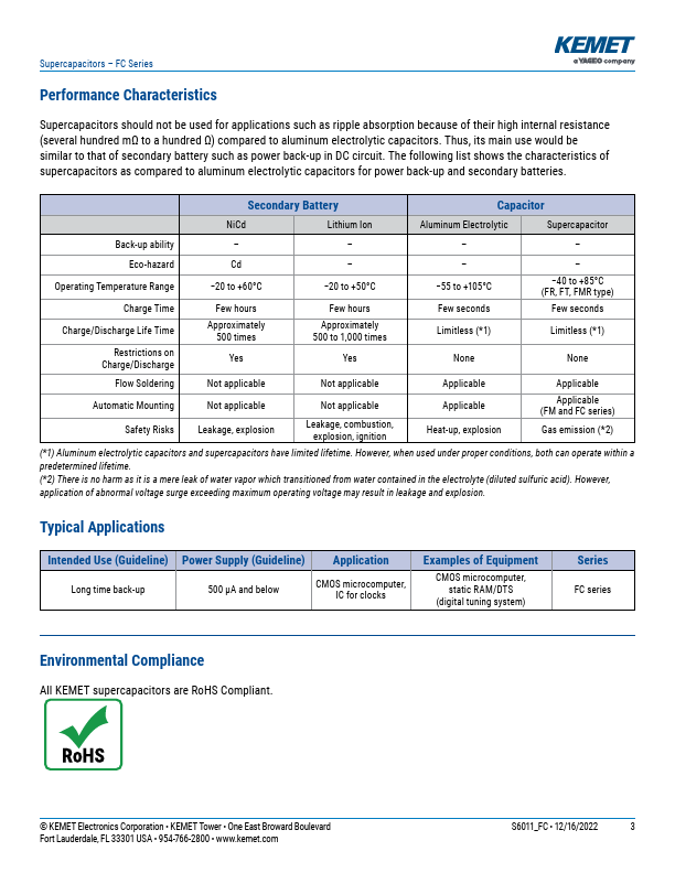 Supercapacitors FC Series Overview FC Series Supercapacitors, also known as Electric Double-Layer Capacitors (EDLCs), are surface mount type ponents intended for high energy storage applications. The FC Series is designed specifically for reflow soldering, allowing them to be attached to a printed circuit board (PCB) directly. Applications Supercapacitors have characteristics ranging from traditional capacitors and...