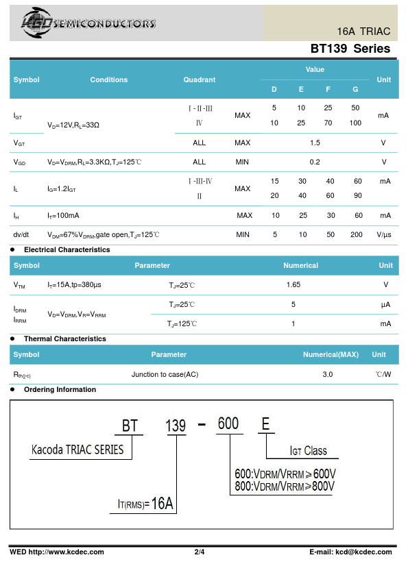 - Features: Blocking voltage to 600 & 800V On-state RMS current to 16A Non-repetitive peak on-state current to 140A