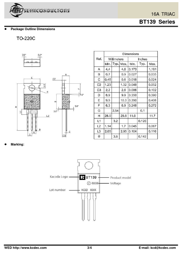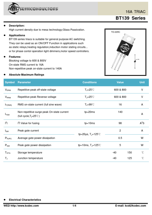 - Features: Blocking voltage to 600 & 800V On-state RMS current to 16A Non-repetitive peak on-state current to 140A
