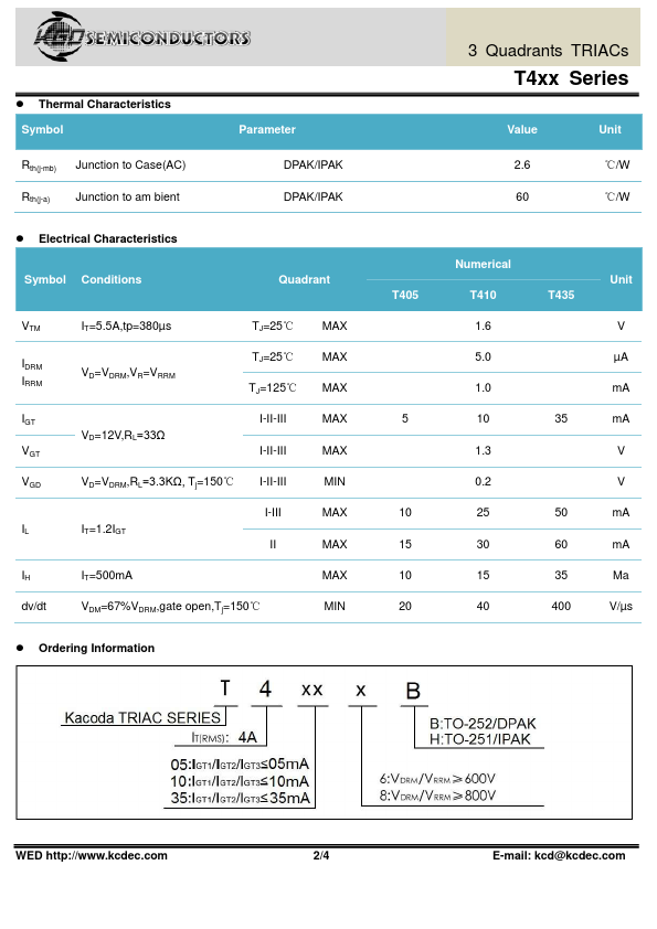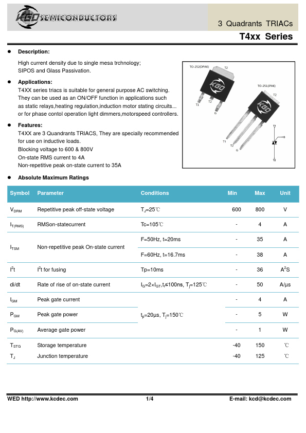 - Features: T4XX are 3 Quandrants TRIACS, They are specially remended for use on inductive loads. Blocking voltage to 600 & 800V On-state RMS current to 4A Non-re