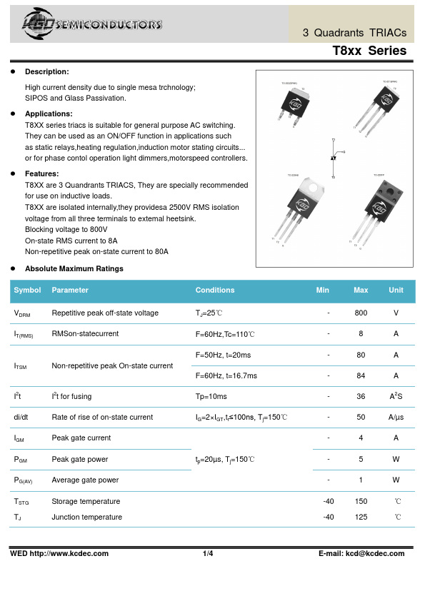 - Features: T8XX are 3 Quandrants TRIACS, They are specially remended for use on inductive loads. T8XX are isolated internally,they providesa 2500V RMS isolation