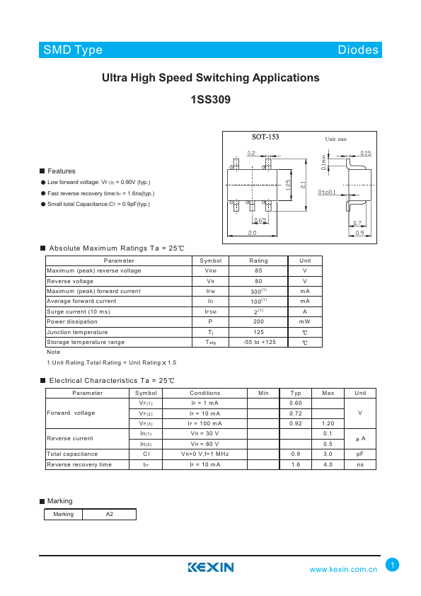 SMD Type Diodes Ultra High Speed Switching Applications 1SS309.