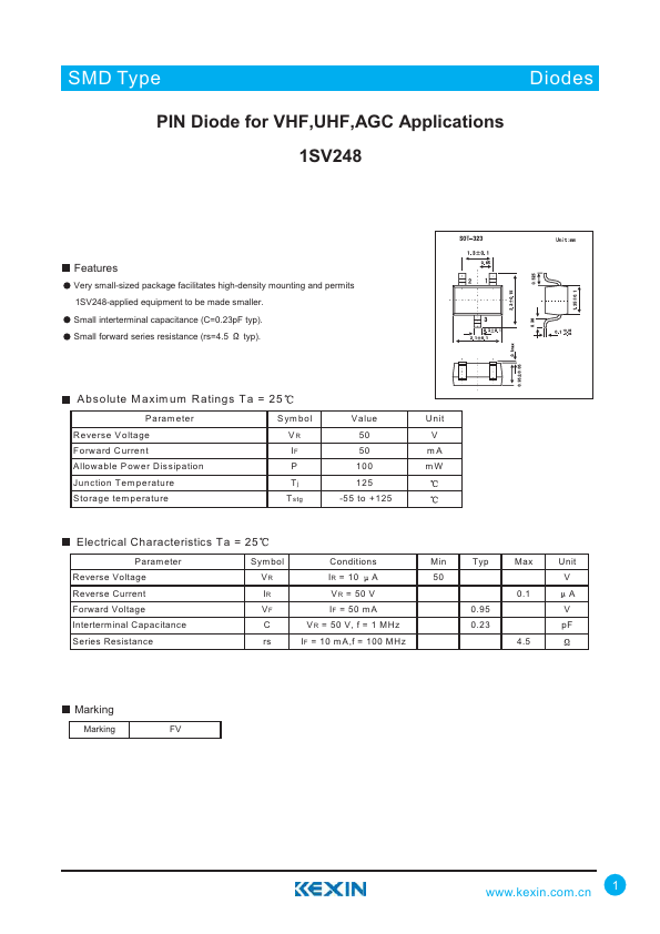 SMD Type Diodes PIN Diode for VHF,UHF,AGC Applications 1SV248.