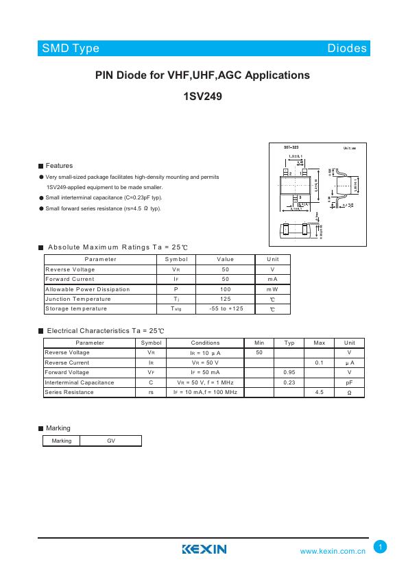 SMD Type Diodes PIN Diode for VHF,UHF,AGC Applications 1SV249.