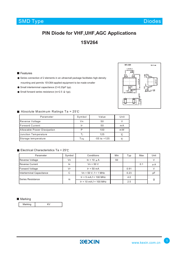 SMD Type Diodes PIN Diode for VHF,UHF,AGC Applications 1SV264.