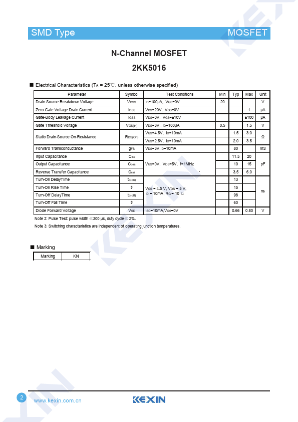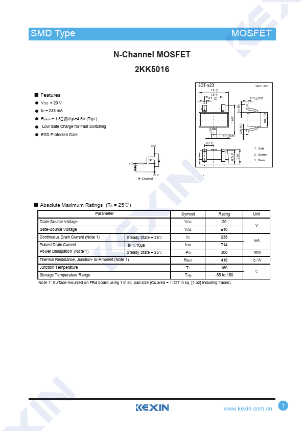 ● VDS = 20 V ● ID = 238 mA ● Rdson = 1.5Ω@Vgs=4.5V (Typ.
