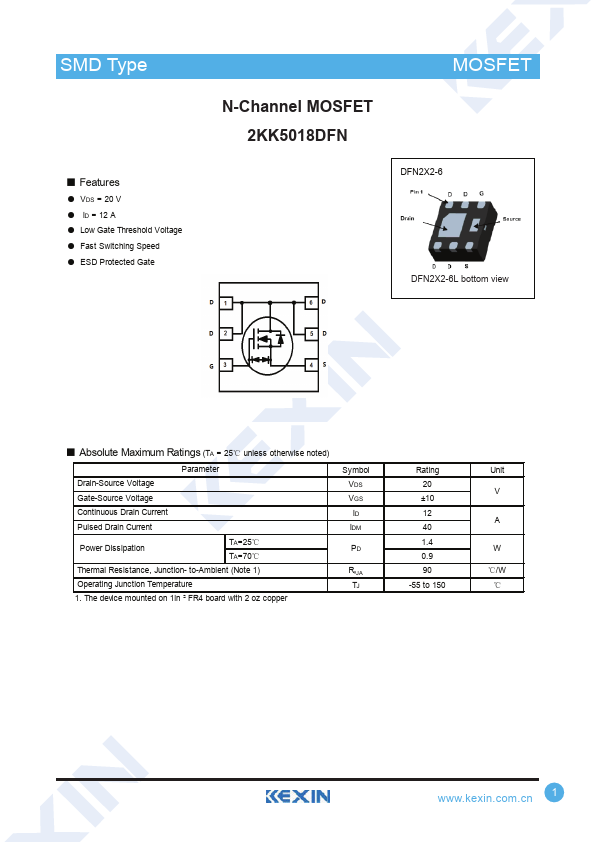 ● VDS = 20 V ● ID = 12 A ● Low Gate Threshold Voltage ● Fast Switching Speed ● ESD Protected Gate
