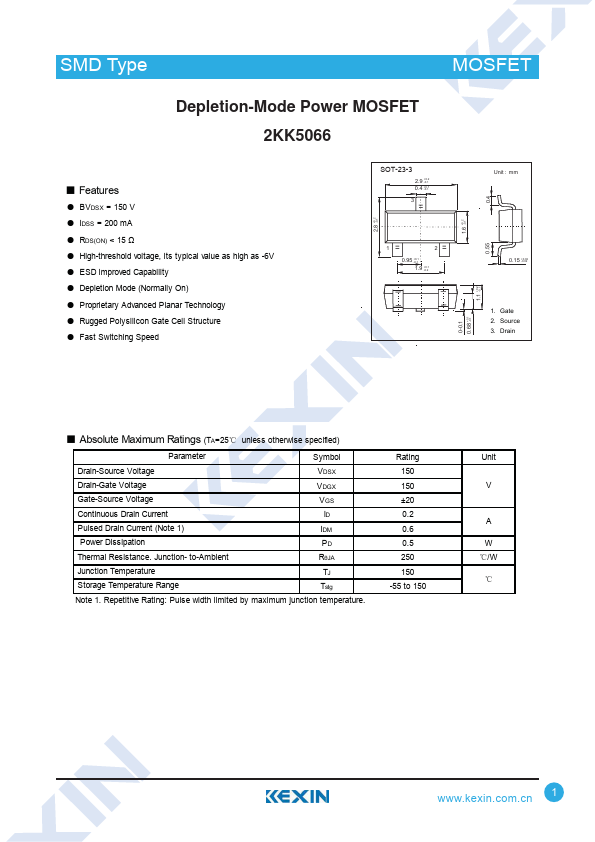 ƽ BVDSX = 150 V ƽ IDSS = 200 mA ƽ RDS(ON) < 15 ƽ High-threshold voltage, its typical value as high as -6V ƽ ESD improved Capability ƽ Depletion Mode (Normally On) ƽ Proprietary Advanced Planar Technology ƽ Rugged Polysilicon Gate Cell Structure ƽ Fast Switching Speed