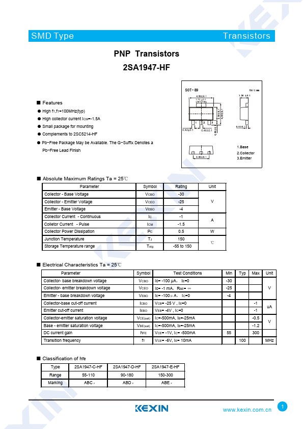 ● High fT,fT=100MHz(typ) ● High collector current ICM=-1.5A ● Small package for mounting ● Complements to 2SC5214-HF ● Pb−Free Package May be Available. The G−Suffix Denotes a
