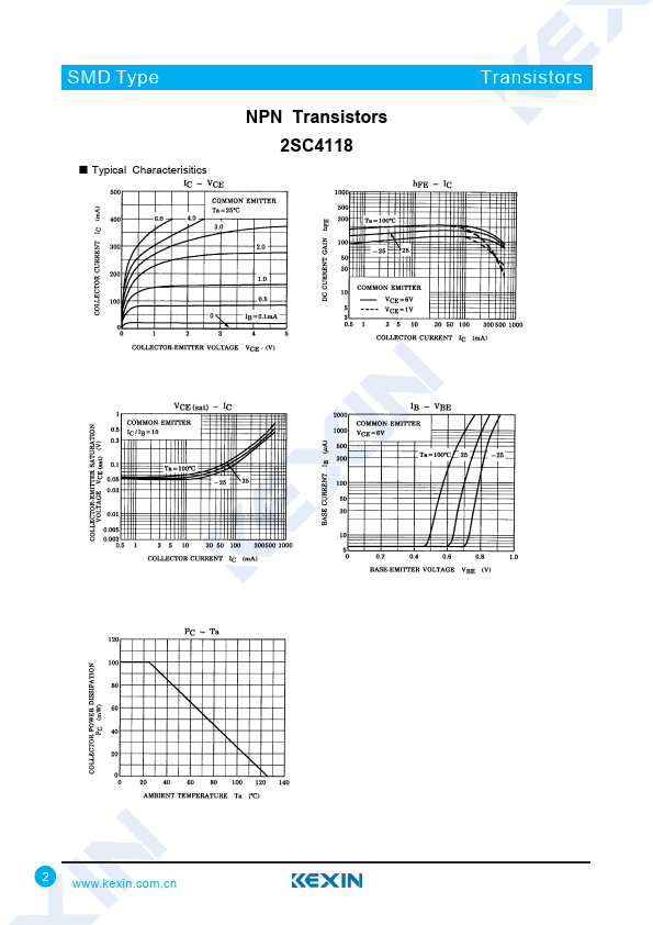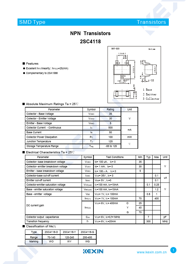 SMD Type NPN Transistors 2SC4118 Transistors ■ Features ● Excellent hFE linearity:: hFE(2)=25(min) ● Complementary to 2SA1588 ■ Absolute Maximum Ratings Ta = 25℃ Paramete...