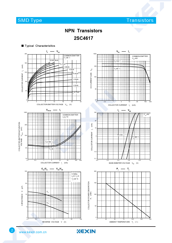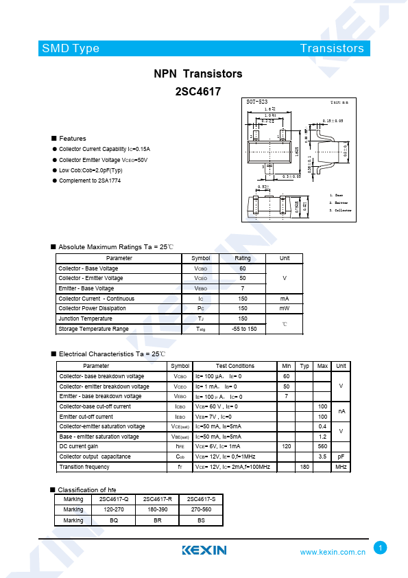 SMD Type Transistors NPN Transistors 2SC4617 SOT-523 1.6 +0.1 -0.1 1.0 +0.1 -0.1 0.2 +0.05 -0.05 ■ Features ● Collector Current Capability IC=0.15A ● Collector Emitter Vo...