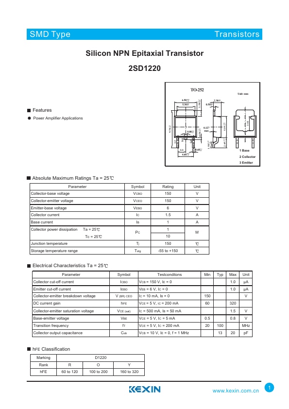 + 9.70 0.2 -0.2 TO-252 6.50+0.15 -0.15 5.30+0.2 -0.2 2.30+0.1 -0.1 0.50+0.8 -0.7 Unit: mm + 1.50 0.15 -0.15 + 5.55 0.15 -0.15 0.80+0.1 -0.1 0.127 max 3.80 + 0.25 2 .6 5 -0.1 + 0.15 0 .5 0 -0.15 + 0.28 1 .5 0 -0.1 2.3 4.60+0.15 -0.15 0.60+0.1 -0.1 1 Base 2 Collector 3 Emitter Absolute Maximum Ratings Ta = 25 Parameter Collector-base voltage Collector-emitter voltage Emitter-base voltage Collector current Base current Collector power dissipation Ta = 25 Tc = 25 Junction temperature Storage temperature range Symbol Rating Unit VCBO 150 V VCEO 150 V VEBO 6 V IC 1.