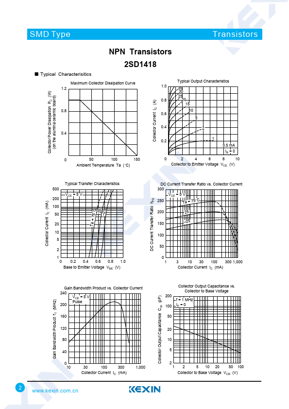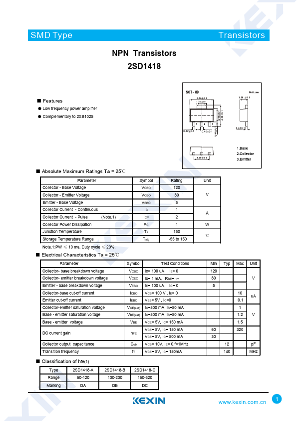 SMD Type NPN Transistors 2SD1418 Transistors ■ Features ● Low frequency power amplifier ● Complementary to 2SB1025 1.70 0.1 0.42 0.1 0.46 0.1 ■ Absolute Maximum Ratings T...