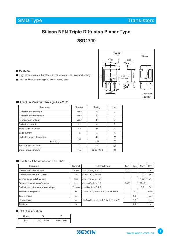 SMD Type Transistors Silicon NPN Triple Diffusion Planar Type 2SD1719 Features High forward current transfer ratio hFE which has satisfactory linearity High emitter-base ...