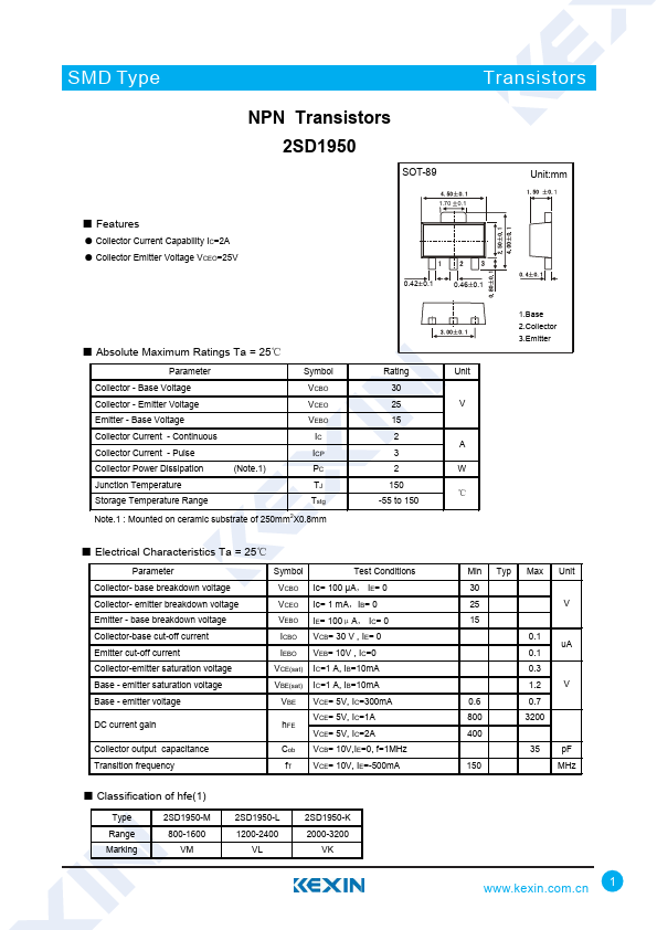 SMD Type Transistors NPN Transistors 2SD1950 SOT-89 Unit:mm ■.