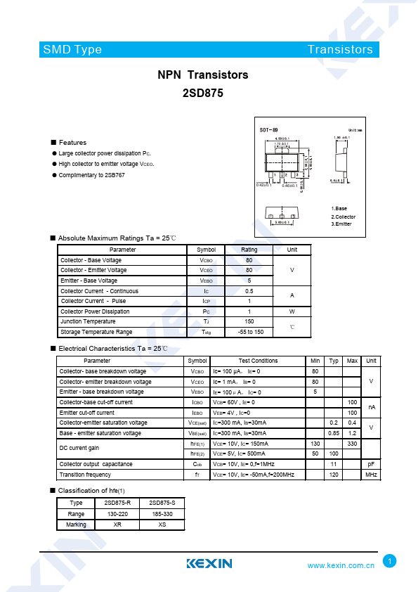 Overview: SMD Type NPN Transistors 2SD875 Transistors ■.