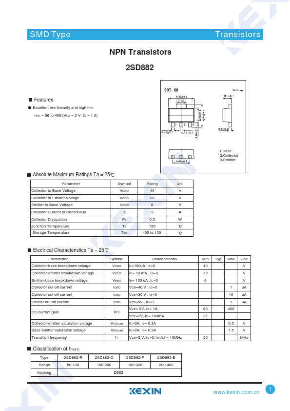 Overview: SMD Type NPN Transistors 2SD882 Transistors.