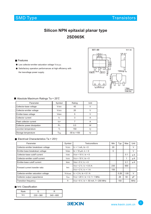 Overview: SMD Type TransistIoCrs Silicon NPN epitaxial planar type 2SD965K.