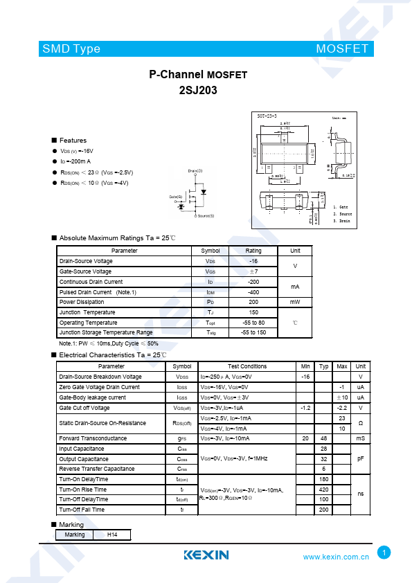 ● VDS (V) =-16V ● ID =-200m A ● RDS(ON) < 23Ω (VGS =-2.5V) ● RDS(ON) < 10Ω (VGS =-4V)