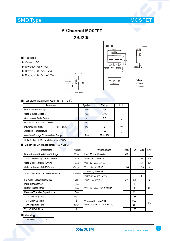 ● VDS (V) =-16V ● ID =-0.5 A (VGS =-10V) ● RDS(ON) < 3Ω (VGS =-4V) ● RDS(ON) < 5Ω (VGS =-2.5V)