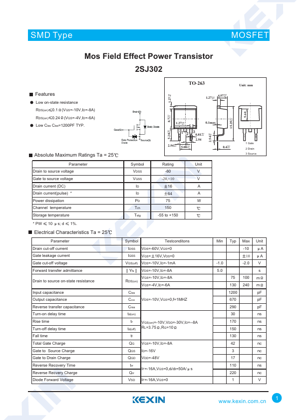 Low on-state resistance RDS(on) 0.1 (VGS=-10V,ID=-8A) RDS(on) 0.24 (VGS=-4V,ID=-6A) Low Ciss Ciss=1200PF TYP.