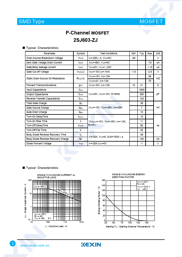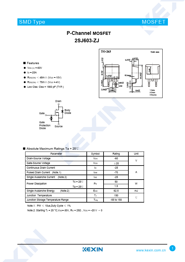 Note.1: PW ≤ 10us,Duty Cycle ≤ 1% Note.2: Starting TJ = 25 °C,VDD=-30V, RG = 25Ω , VGS = –20 V → 0