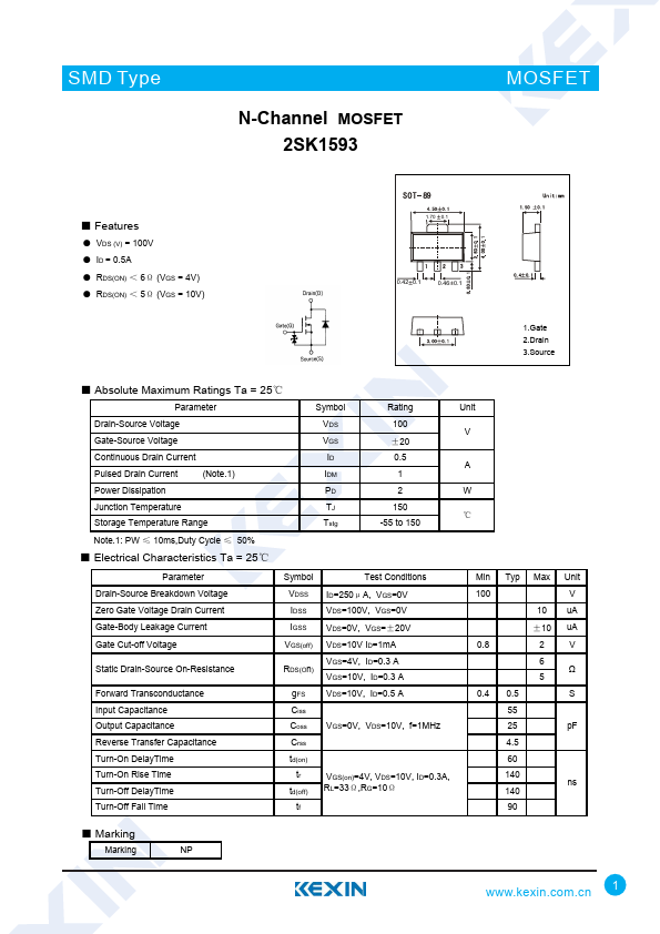 ● VDS (V) = 100V ● ID = 0.5A ● RDS(ON) < 6Ω (VGS = 4V) ● RDS(ON) < 5Ω (VGS = 10V)