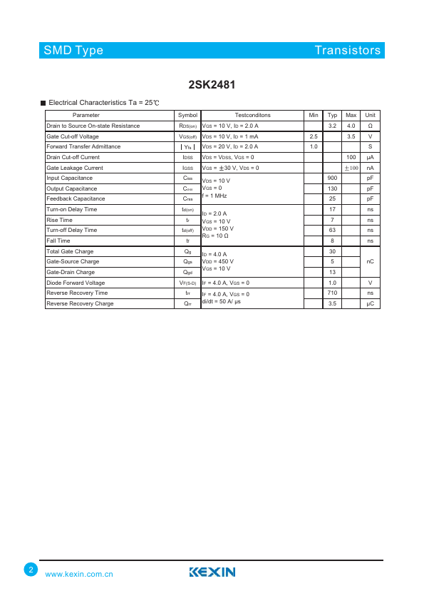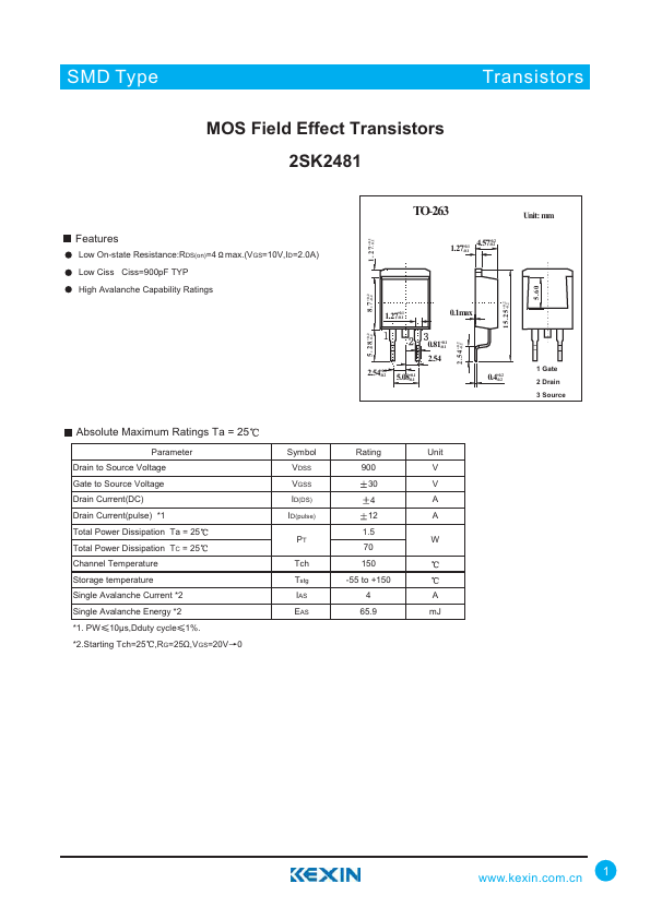 Low On-state Resistance:RDS(on)=4 max.(VGS=10V,ID=2.0A) Low Ciss Ciss=900pF TYP High Avalanche Capability Ratings