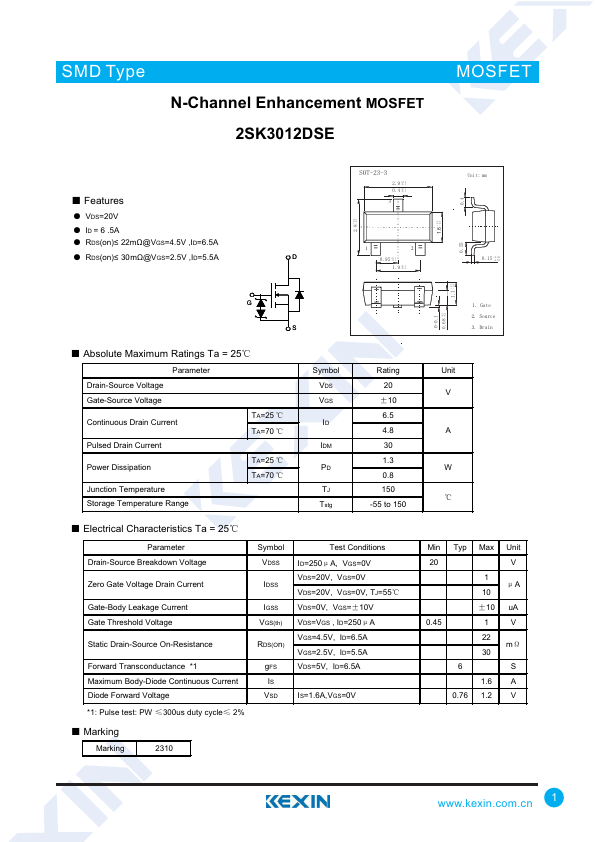 N-Channel Enhancement MOSFET 2SK3012DSE