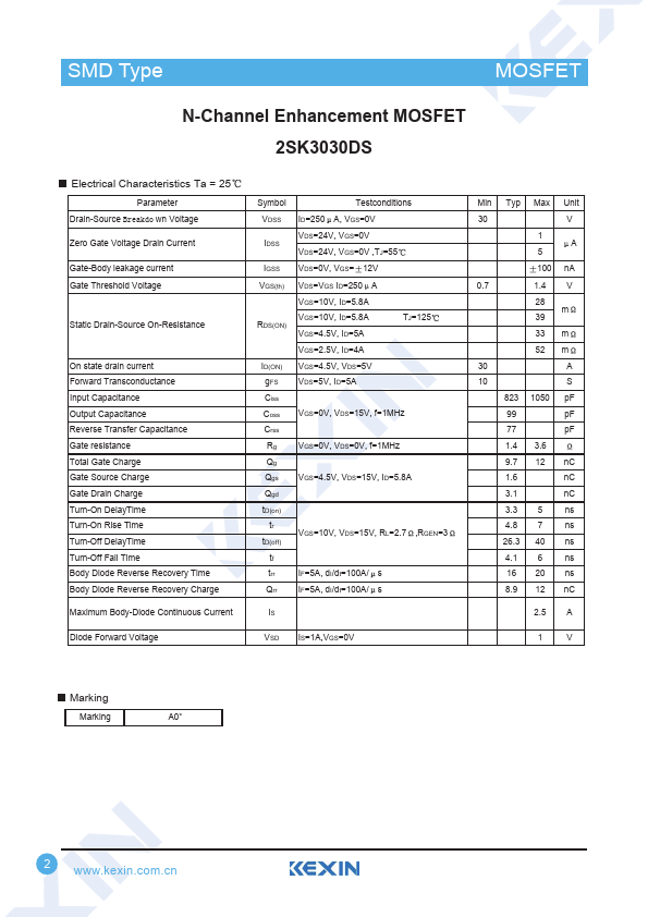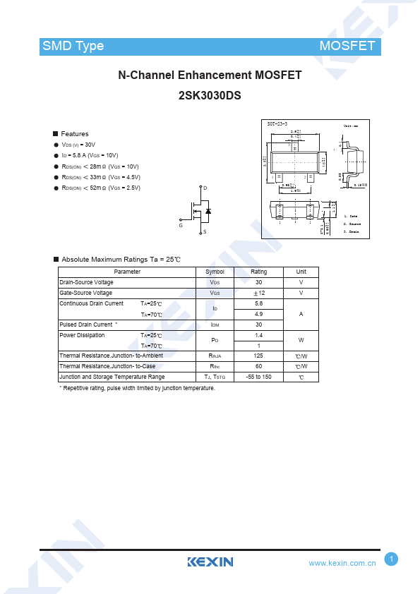 VDS (V) = 30V ID = 5.8 A (VGS = 10V) RDS(ON) 28m (VGS = 10V) RDS(ON) 33m (VGS = 4.5V) RDS(ON) 52m (VGS = 2.5V)