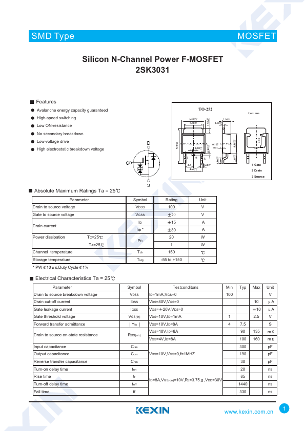 Avalanche energy capacity guaranteed High-speed switching Low ON-resistance No secondary breakdown Low-voltage drive High electrostatic breakdown voltage