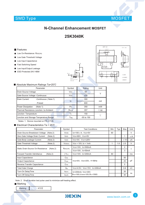 Low On-Resistance: RDS(ON) Low Gate Threshold Voltage Low Input Capacitance Fast Switching Speed Low Input/Output Leakage ƽ ESD Protected 2KV HBM
