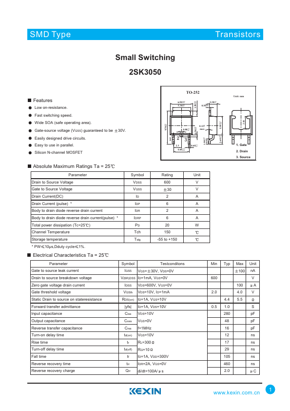 Low on-resistance. Fast switching speed. Wide SOA (safe operating area). Gate-source voltage (VGSS) guaranteed to be 30V. Easily designed drive circuits. Easy to use in parallel. Silicon N-channel MOSFET