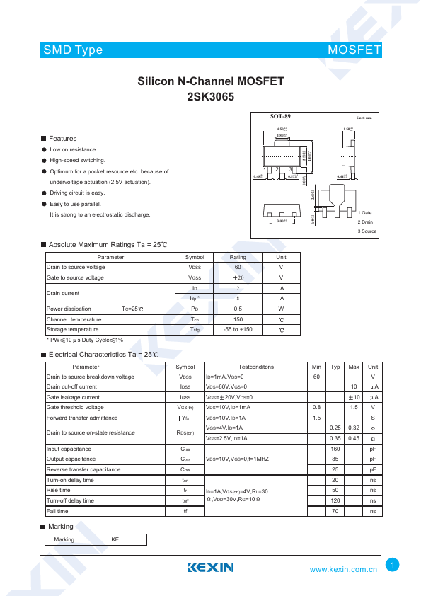 Low on resistance. High-speed switching. Optimum for a pocket resource etc. because of undervoltage actuation (2.5V actuation). Driving circuit is easy. Easy to use parallel. It is strong to an electrostatic discharge. SOT-89