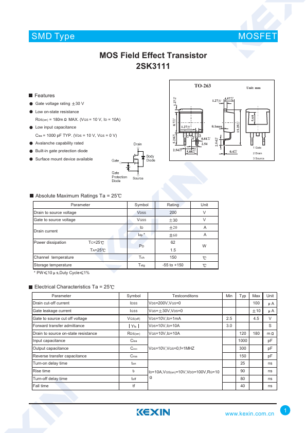 Gate voltage rating 30 V Low on-state resistance RDS(on) = 180m MAX. (VGS = 10 V, ID = 10A) Low input capacitance Ciss = 1000 pF TYP. (VDS = 10 V, VGS = 0 V) Avalanche capability rated Built-in gate protection diode Surface mount device available