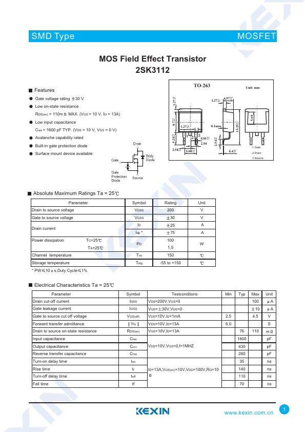Gate voltage rating 30 V Low on-state resistance RDS(on) = 110m MAX. (VGS = 10 V, ID = 13A) Low input capacitance Ciss = 1600 pF TYP. (VDS = 10 V, VGS = 0 V) Avalanche capability rated Built-in gate protection diode Surface mount device available
