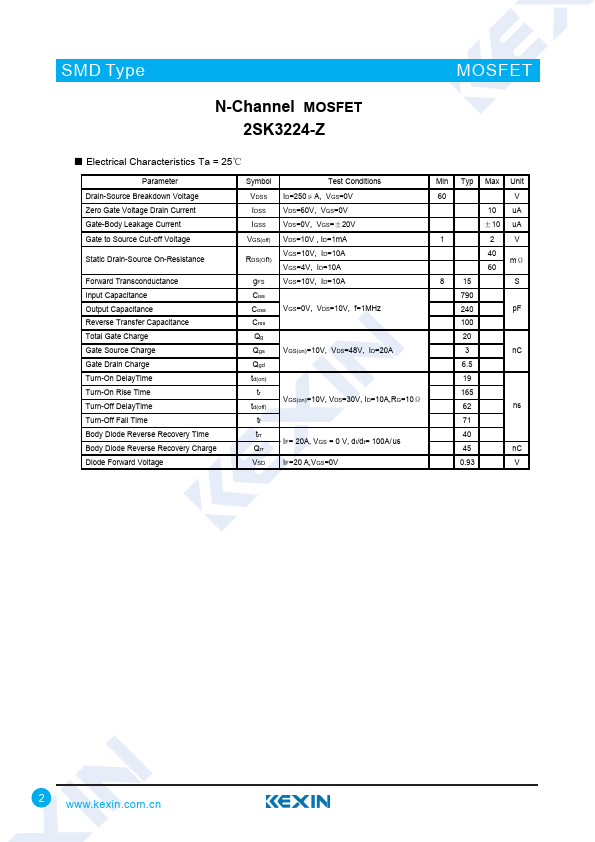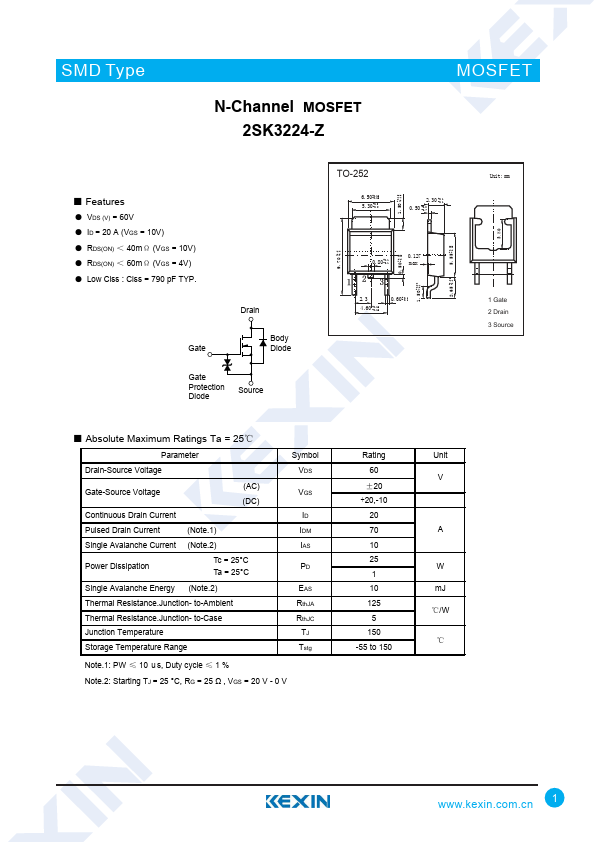 ● VDS (V) = 60V ● ID = 20 A (VGS = 10V) ● RDS(ON) < 40mΩ (VGS = 10V) ● RDS(ON) < 60mΩ (VGS = 4V) ● Low Ciss : Ciss = 790 pF TYP.