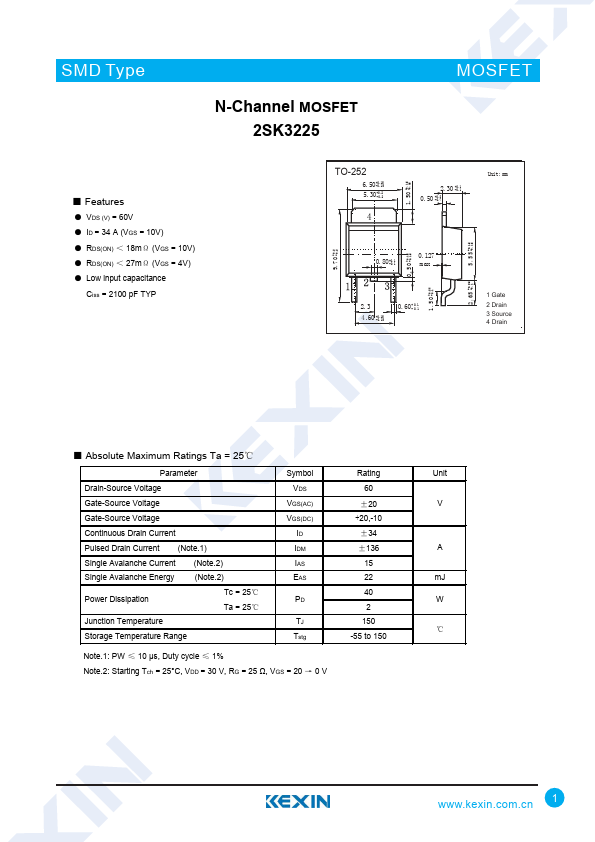 ● VDS (V) = 60V ● ID = 34 A (VGS = 10V) ● RDS(ON) < 18mΩ (VGS = 10V) ● RDS(ON) < 27mΩ (VGS = 4V) ● Low input capacitance