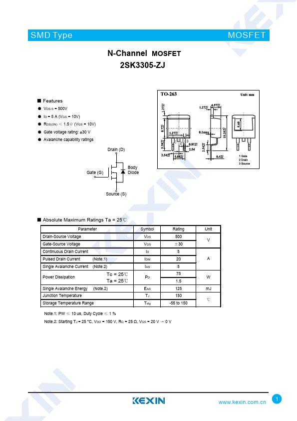 ● VDS S = 500V ● ID = 5 A (VGS = 10V) ● RDS(ON) < 1.5Ω (VGS = 10V) ● Gate voltage rating: ±30 V ● Avalanche capability ratings