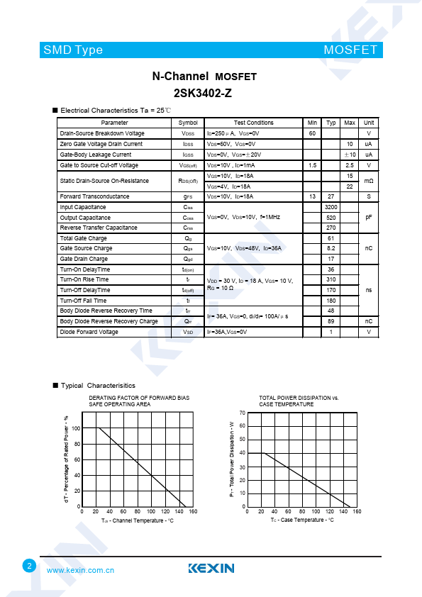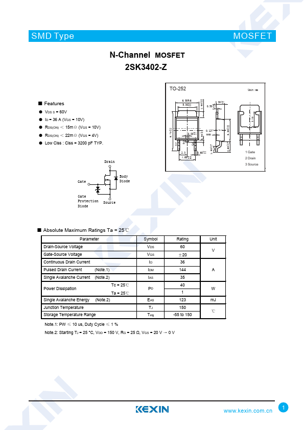 ● VDS S = 60V ● ID = 36 A (VGS = 10V) ● RDS(ON) < 15mΩ (VGS = 10V) ● RDS(ON) < 22mΩ (VGS = 4V) ● Low Ciss : Ciss = 3200 pF TYP.