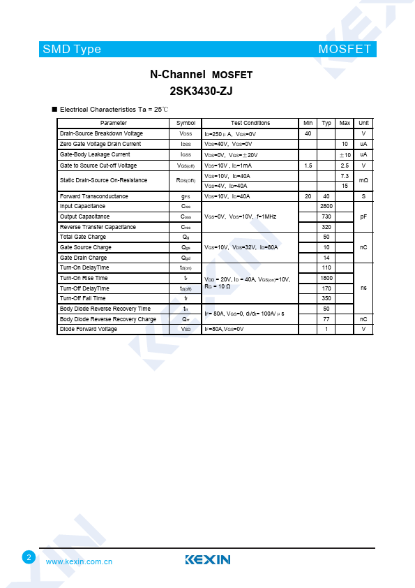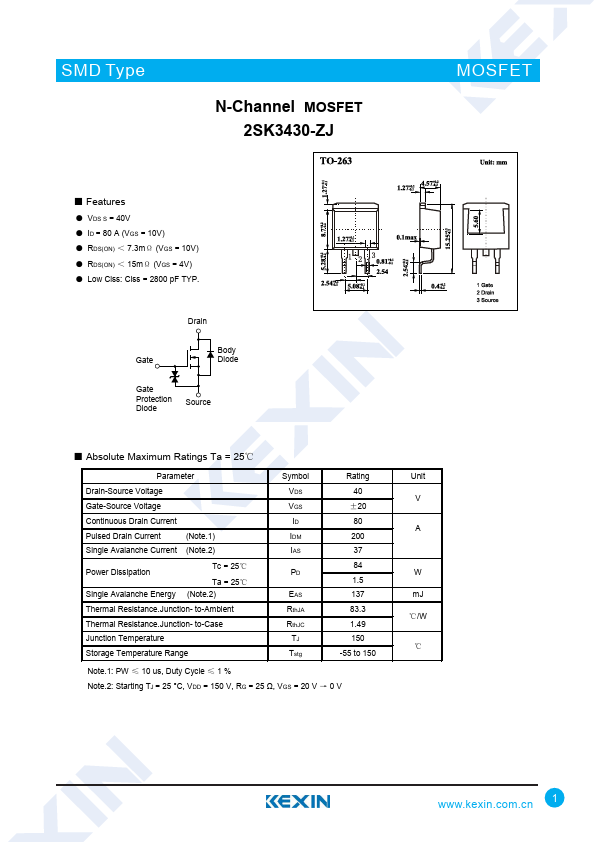 ● VDS S = 40V ● ID = 80 A (VGS = 10V) ● RDS(ON) < 7.3mΩ (VGS = 10V) ● RDS(ON) < 15mΩ (VGS = 4V) ● Low Ciss: Ciss = 2800 pF TYP.