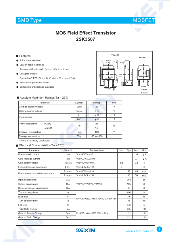 4.5 V drive available Low on-state resistance RDS(on)1 = 45 m MAX. (VGS = 10 V, ID = 11 A) Low gate charge QG = 8.5 nC TYP. (VDD = 24 V, VGS = 10 V, ID = 22 A) Built-in G-S protection diode Surface mount package available