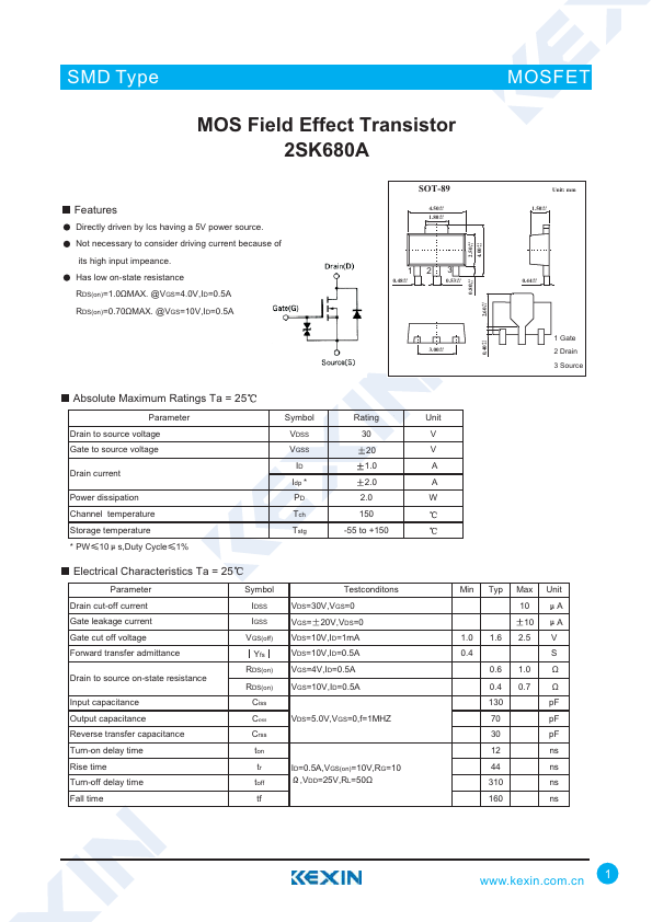 Directly driven by Ics having a 5V power source. Not necessary to consider driving current because of its high input impeance. Has low on-state resistance RDS(on)=1.0ÙMAX. @VGS=4.0V,ID=0.5A RDS(on)=0.70ÙMAX. @VGS=10V,ID=0.5A