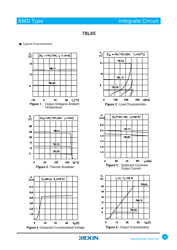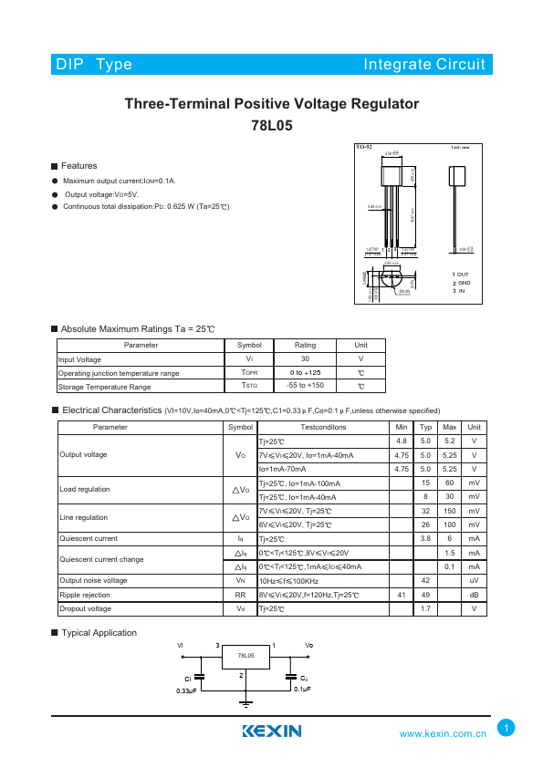 Maximum output current:IOM=0.1A. Output voltage:VO=5V. Continuous total dissipation:PD: 0.625 W (Ta=25 )