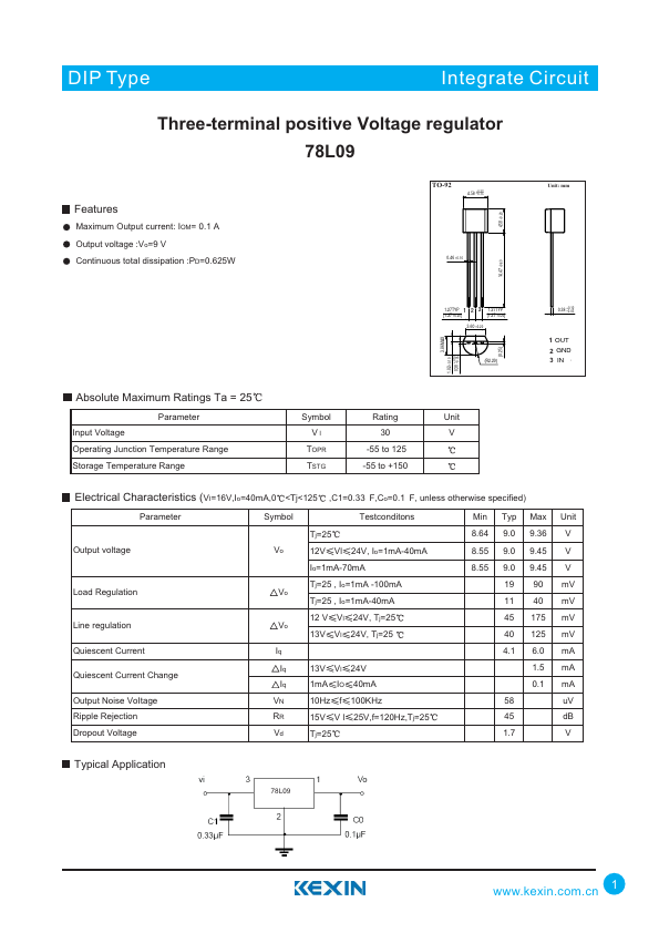 Maximum Output current: IOM= 0.1 A Output voltage :Vo=9 V Continuous total dissipation :PD=0.625W